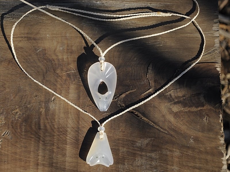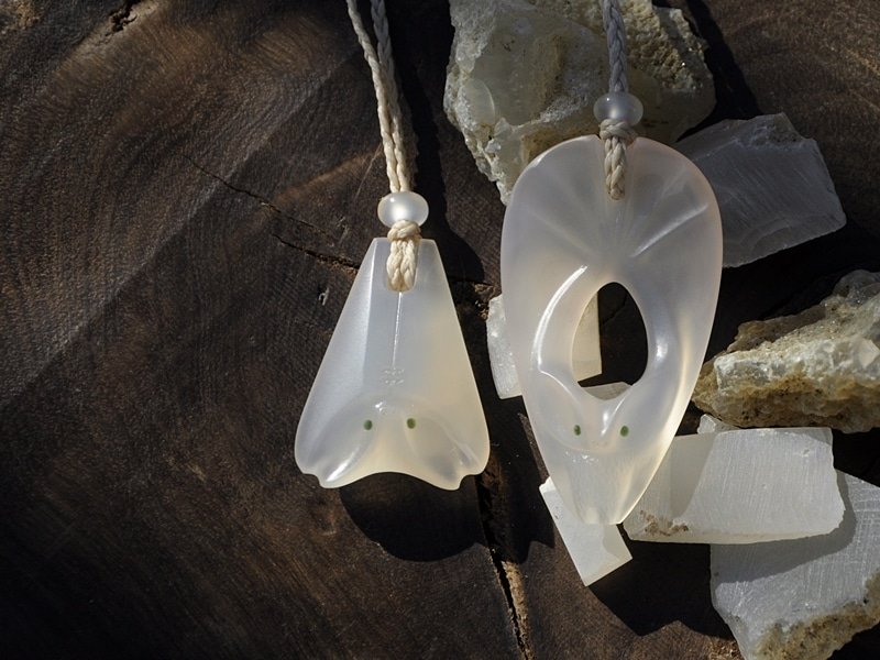 I’ve just finished this commission up. I was asked to make one of each of my bat designs – wings open / wings closed out of NZ Chalcedony with Pounamu eyes.