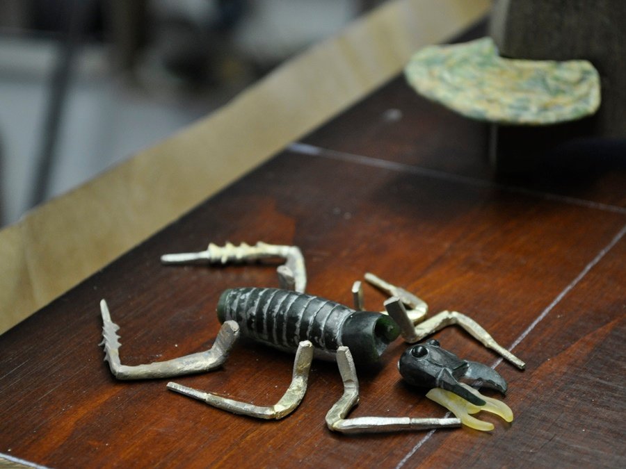 The way I made the wetas legs was to first rough sculpt them in wax (blue) and then cast them in silver before refining and shaping them.