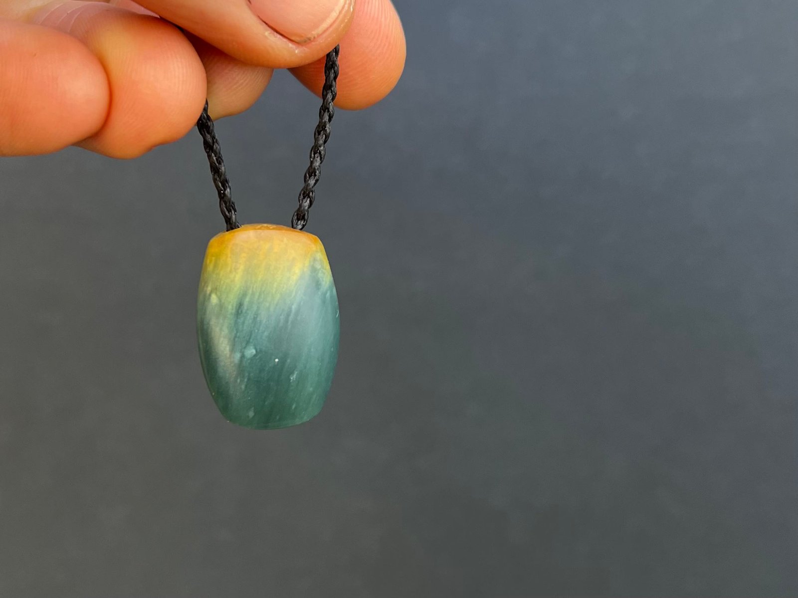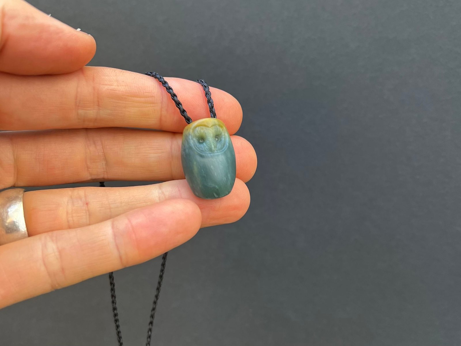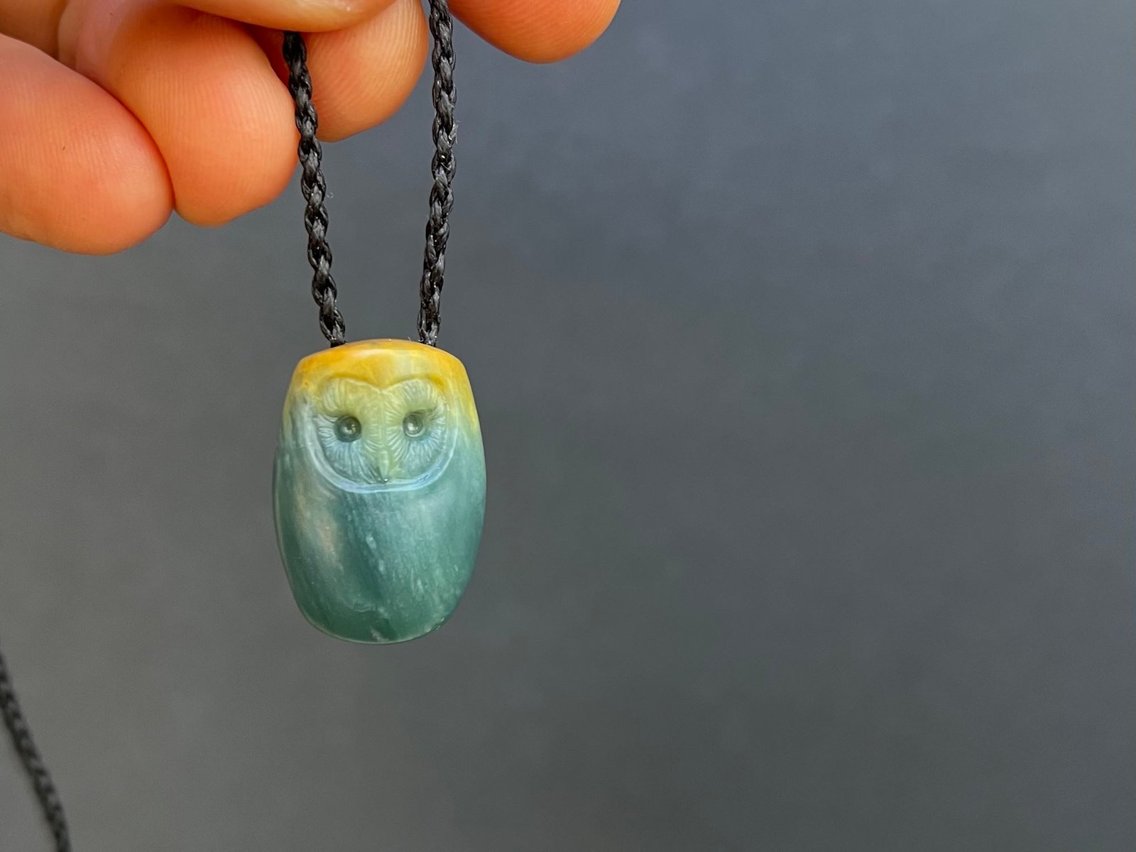I carved this barn owl out of translucent blue jadeite from Guatemala. There’s a little bit of yellow at the head from the outside of the stone.