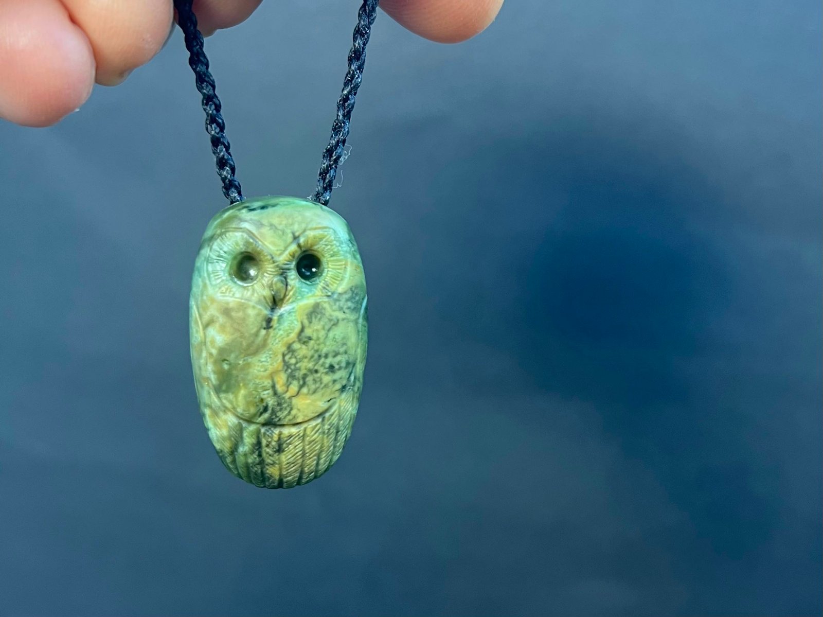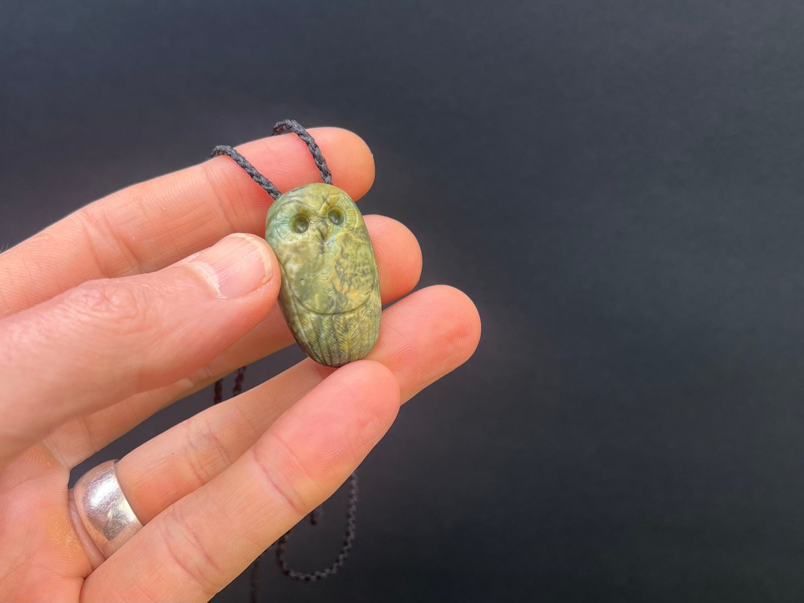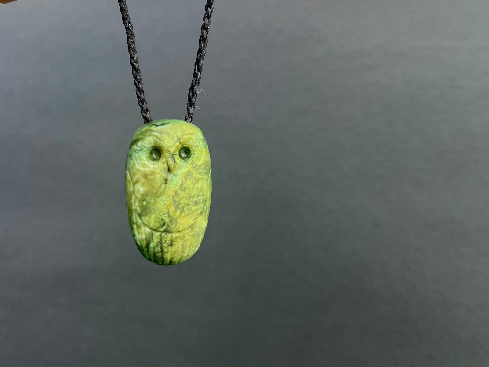 This pendant is of a Ruru / Morepork, one of our native owls. The pounamu is a beautiful mixed camouflaged texture with a greener back.