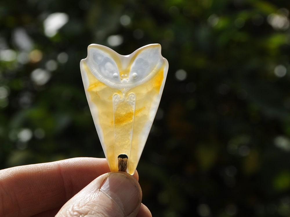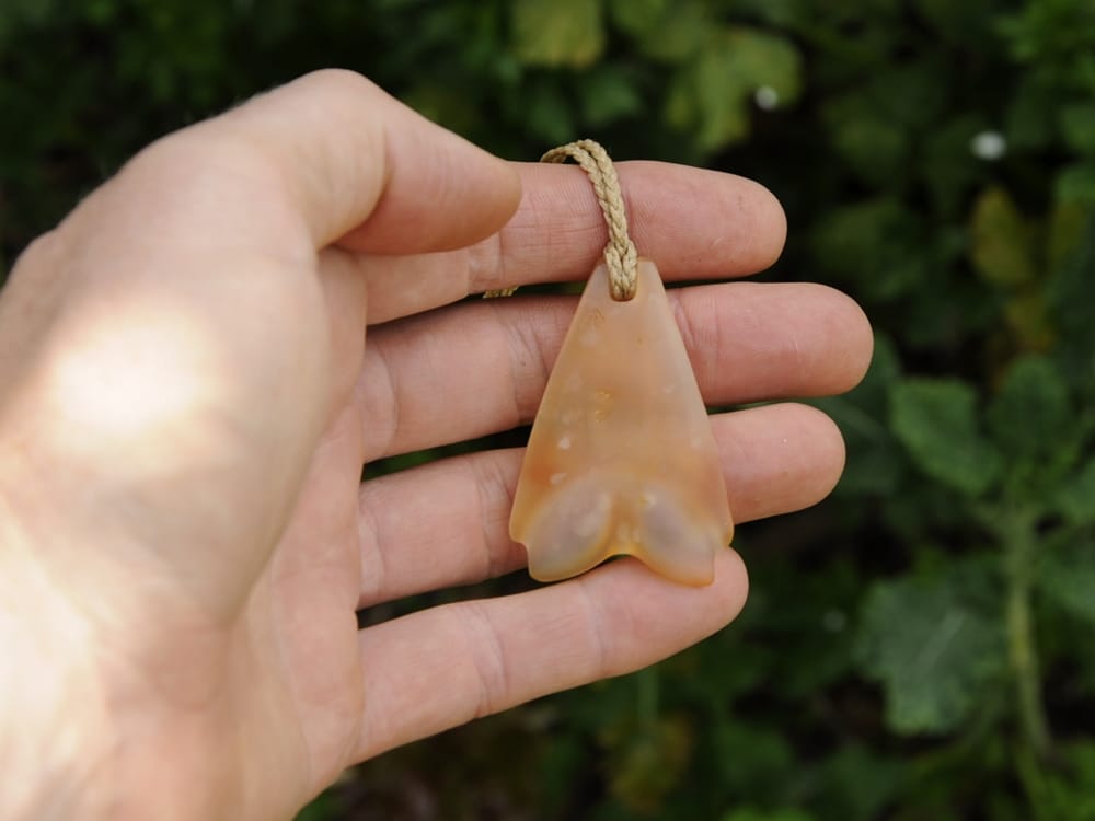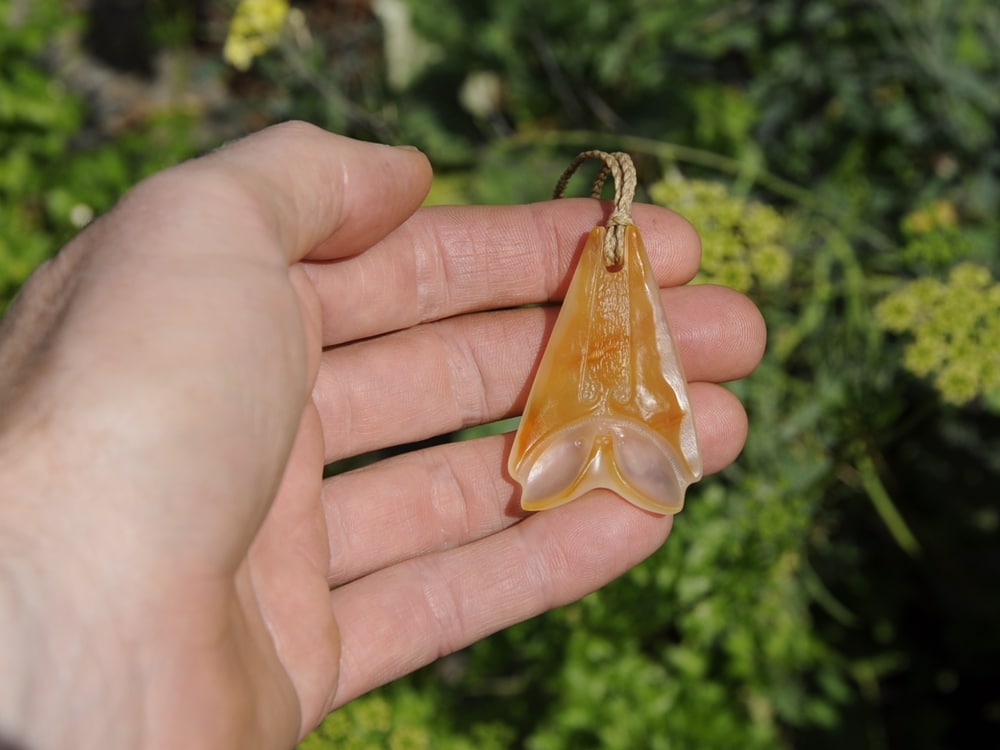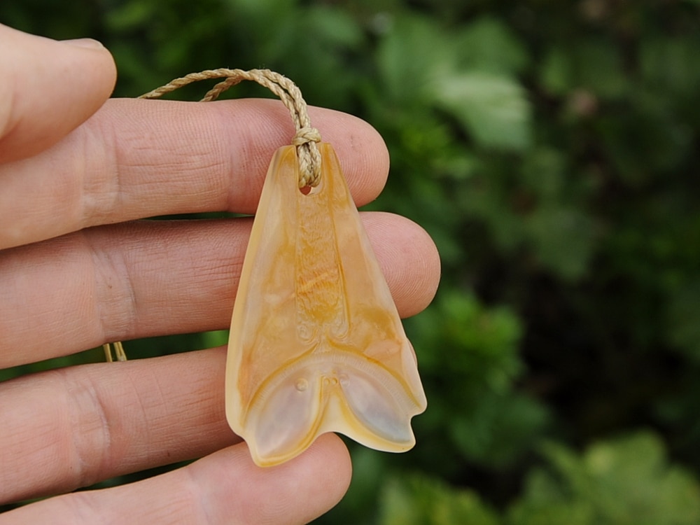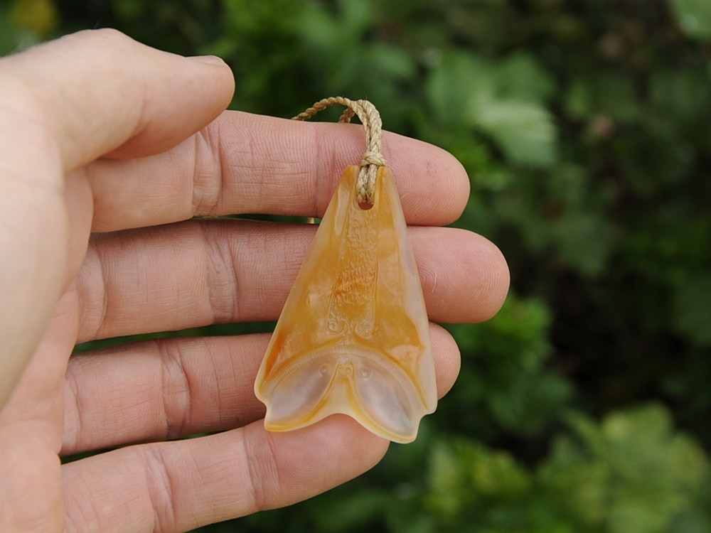 This sculpture/pendant is of a bat / pekapeka. It is a beautiful mix of chalcedony and carnelian.