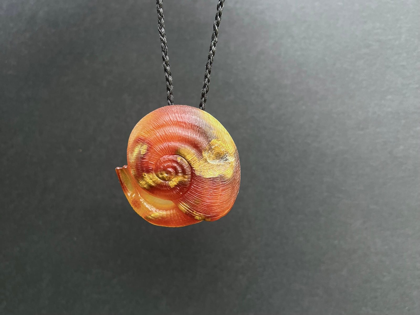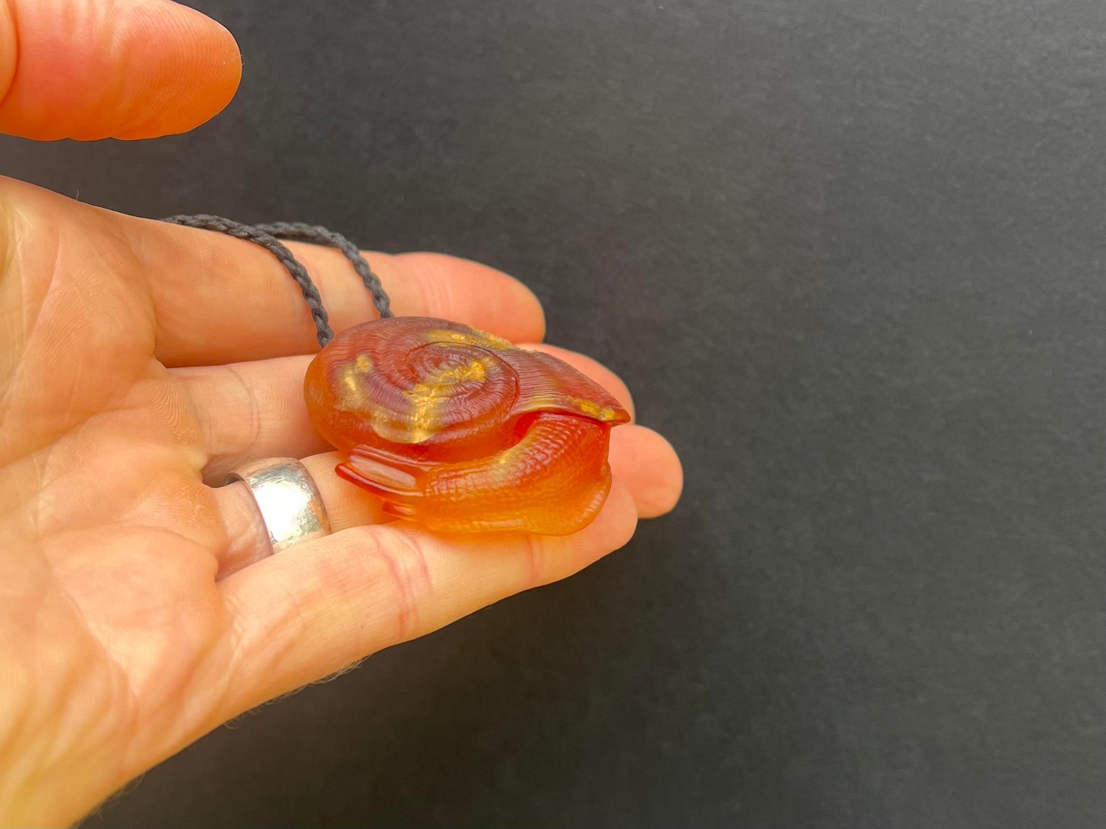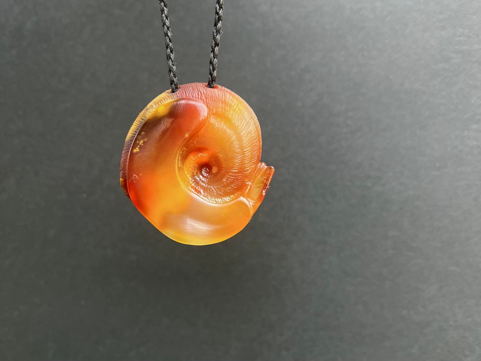 I carved this kauri snail out of a beautiful piece of weathered NZ carnelian. This is the first full snail I’ve carved. It has a small natural cavity where the snail goes into its shell (photo 4). Really nice and translucent, looks wonderful held up to the light.