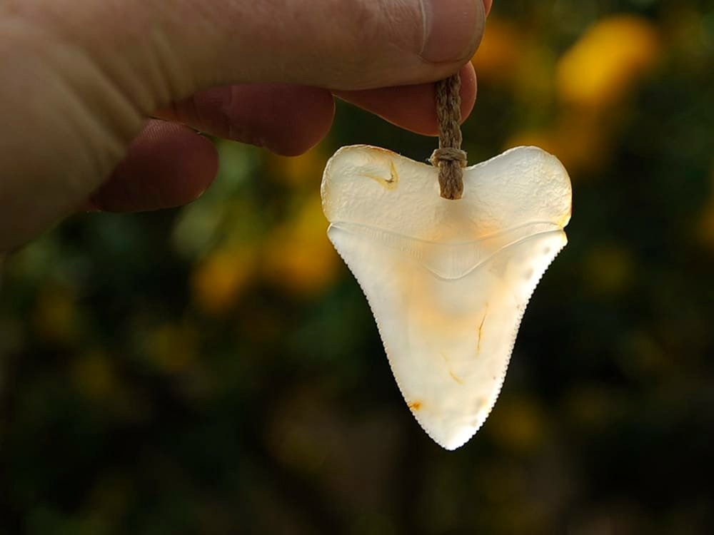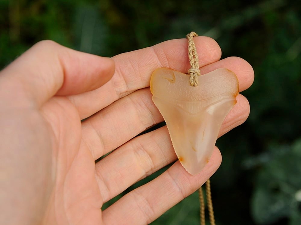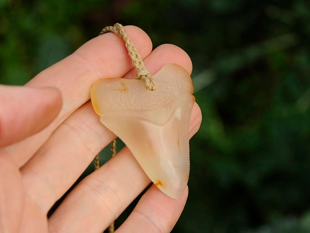 This piece is of a megalodon tooth. It’s a beautiful mix of chalcedony (clear stone) with little carnelian accents.