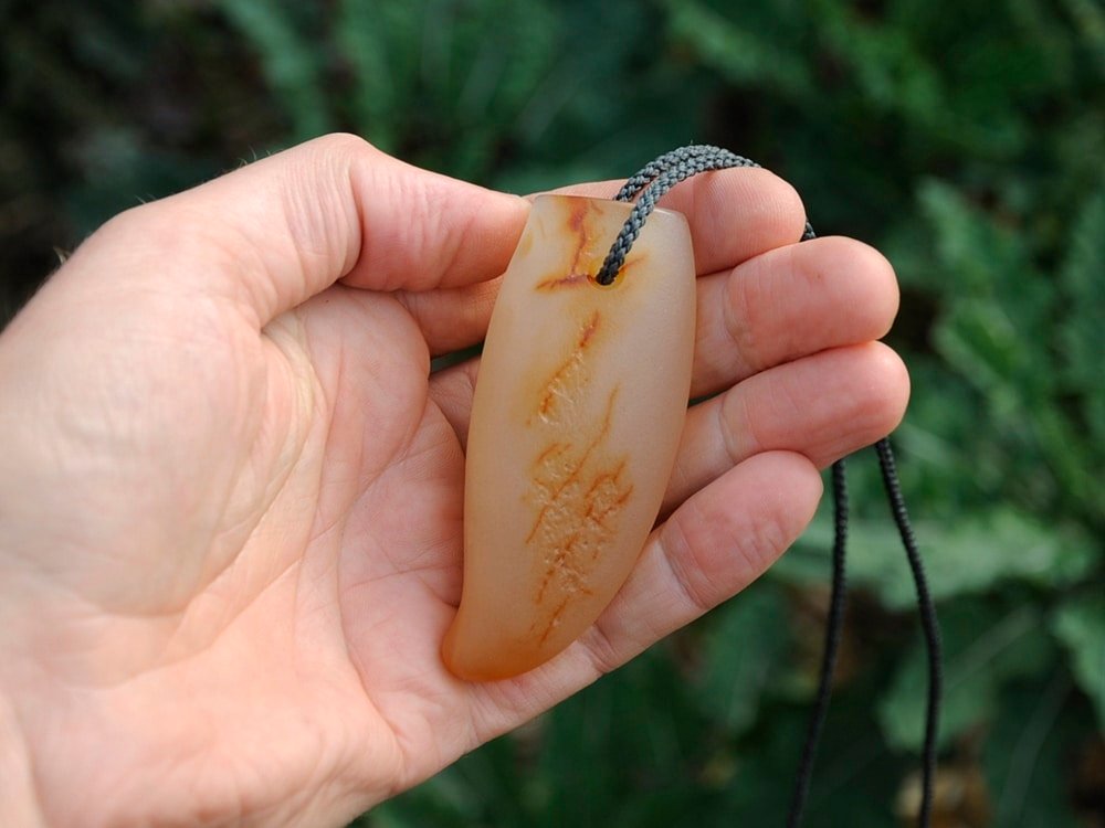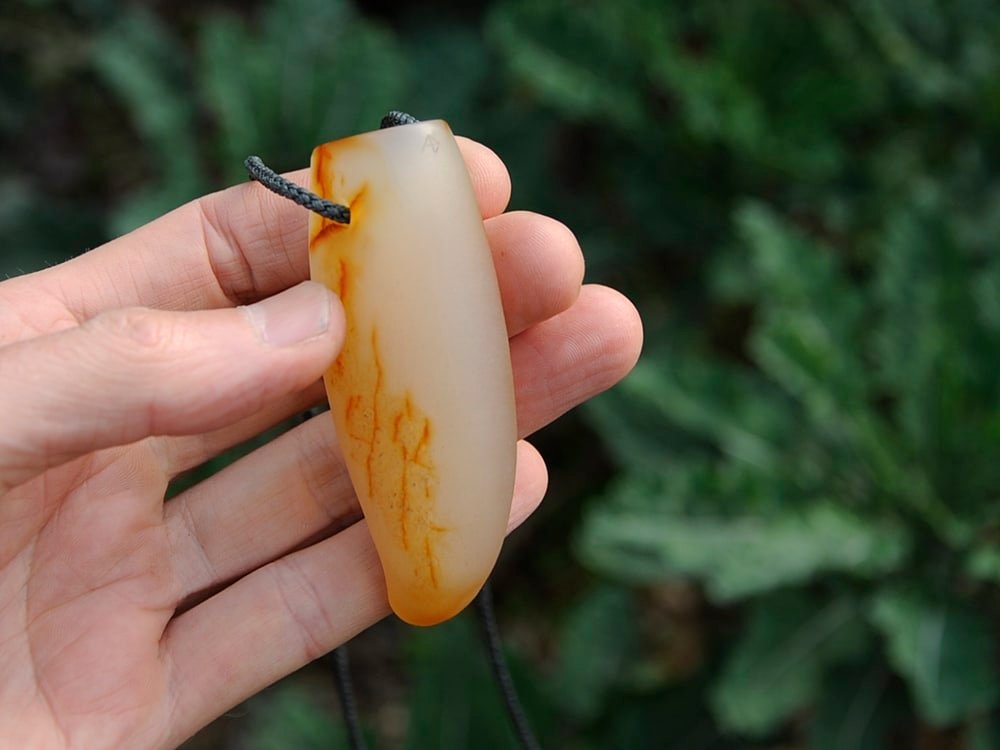 I carved this whale tooth out of a beautiful piece of NZ chalcedony/carnelian. The stone is amazing, beautiful in the sunlight.