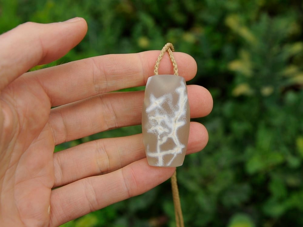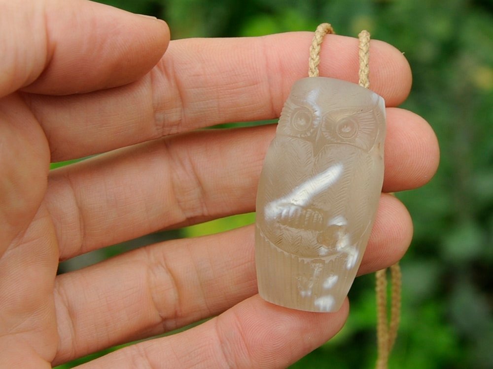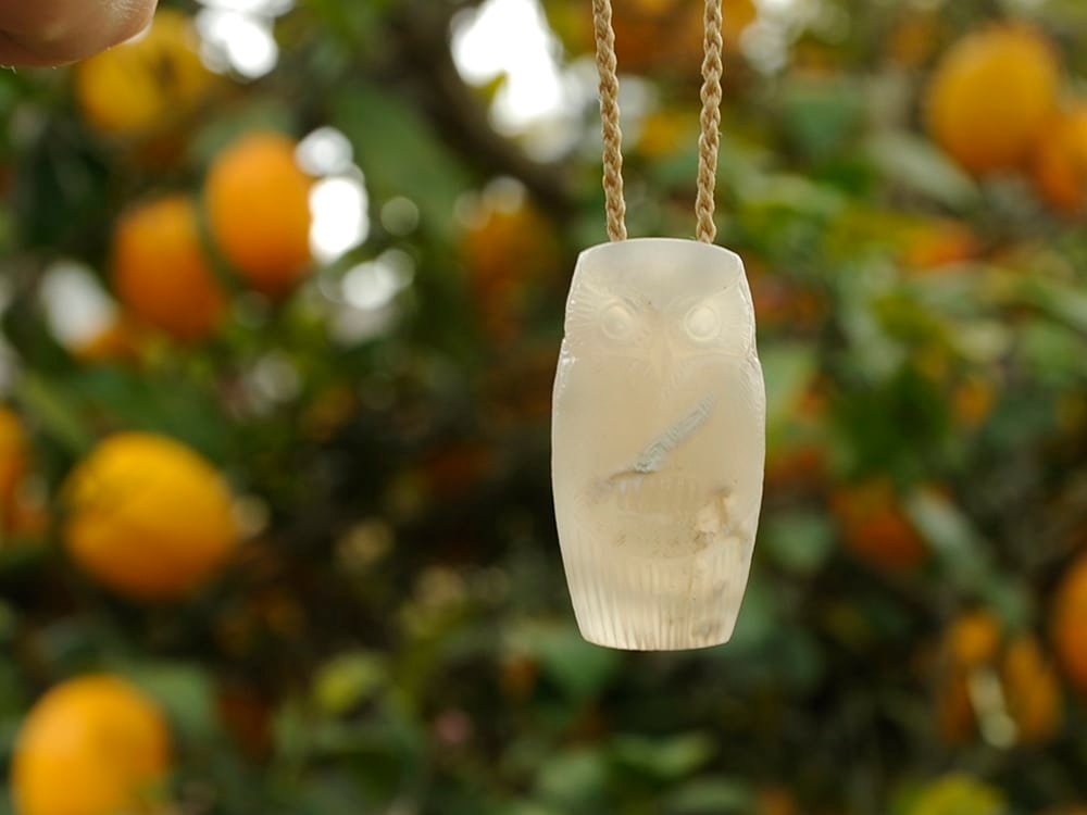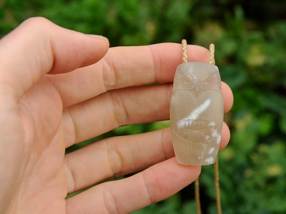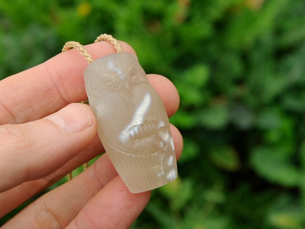 This sculpture/pendant is of a ruru / morkpork. It has beautiful white banding on both sides which contrasts nicely with the clear translucent center. Other than the polished eyes I’ve finished it with a soft matte texture.
