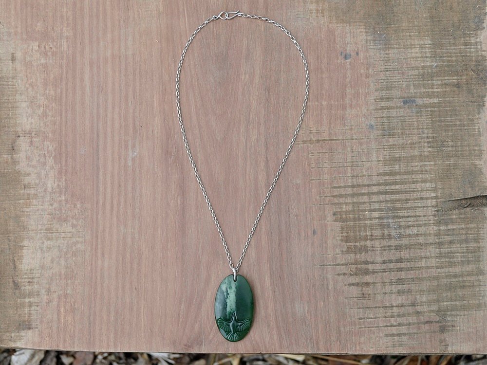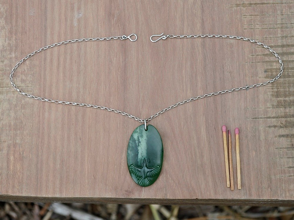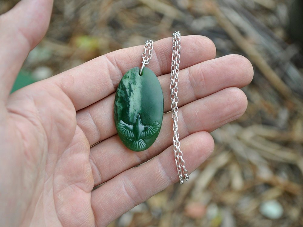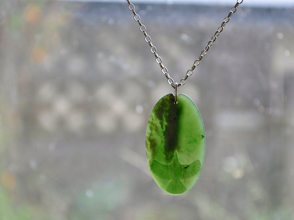 The stone is a highly translucent Pounamu with white inclusions. The carving is of a Tui flying into the clouds of home.