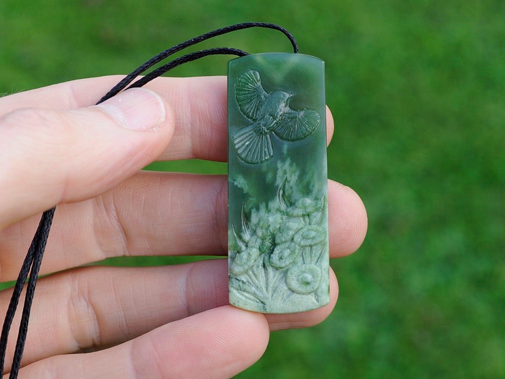 Beautiful translucent Pounamu Fantail over white inclusions carved with daisies. Amazing stone.