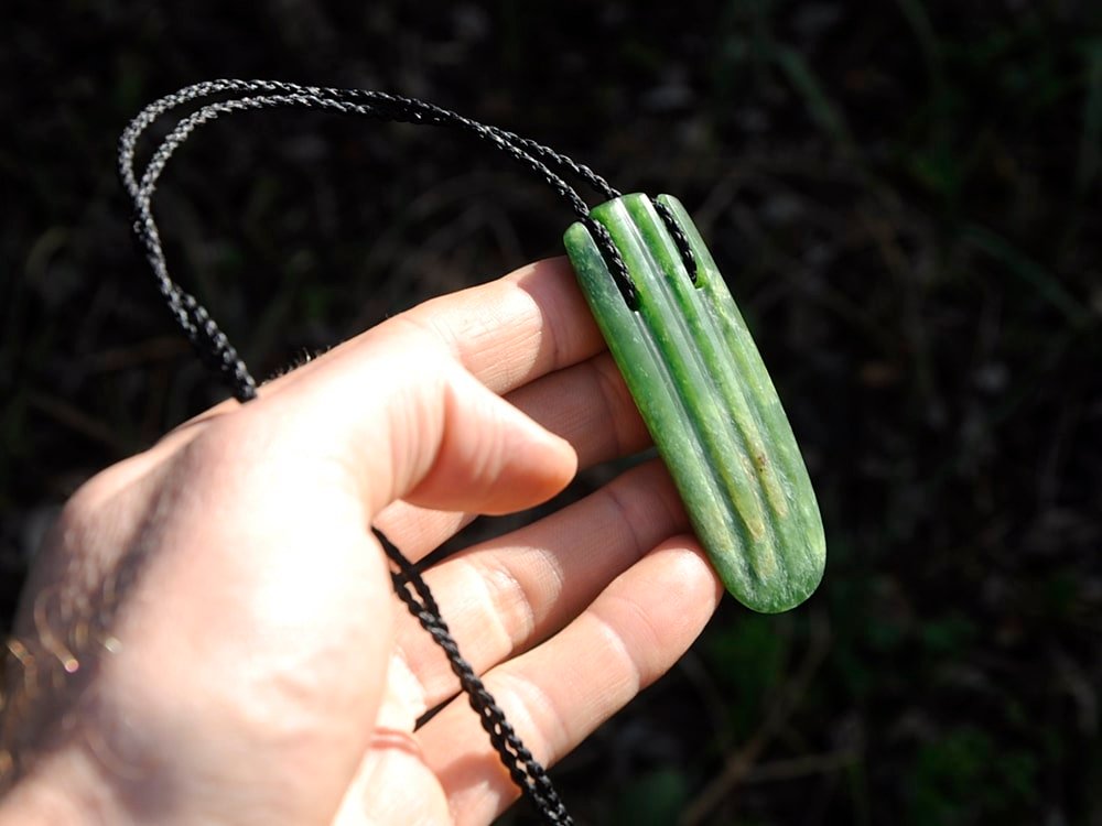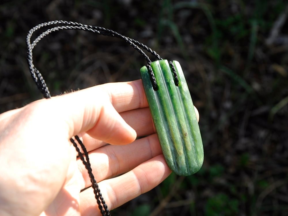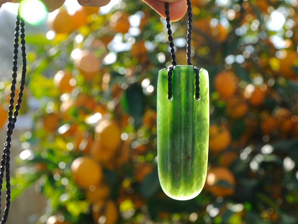 This stone is a medium green translucent Pounamu with beautiful light cloud fractures.