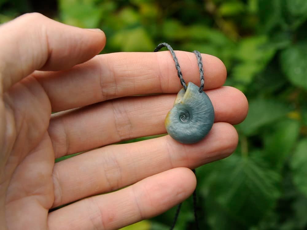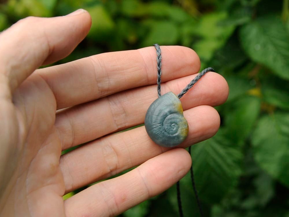 I carved this kauri snail shell out of a beautiful piece of Guatemalan Jadeite.