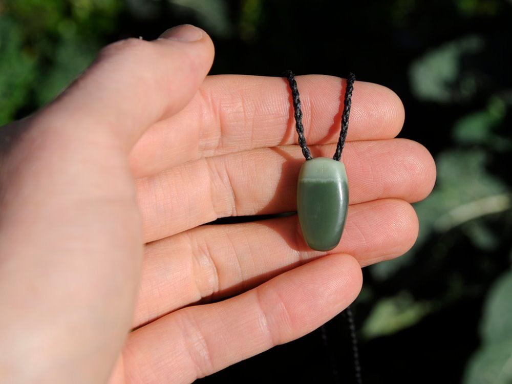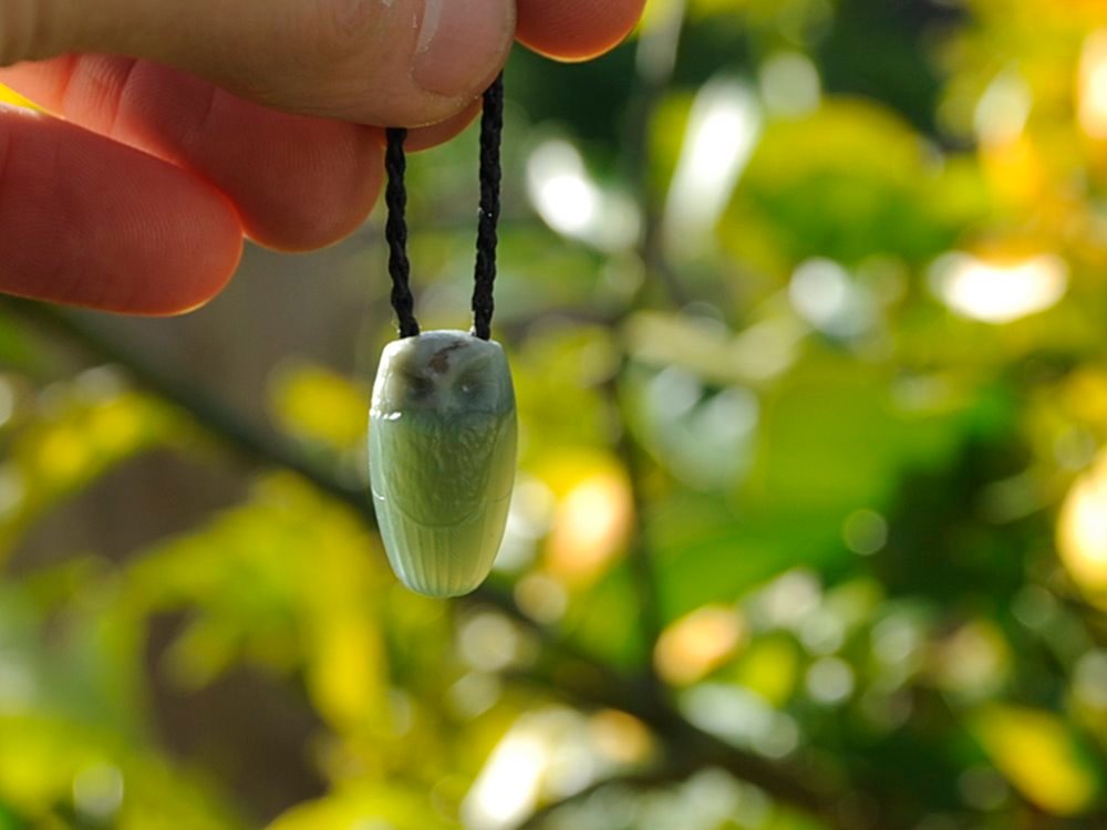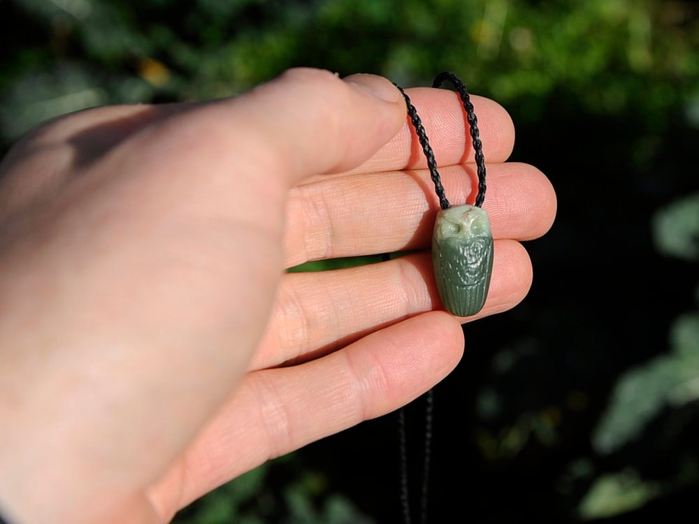 This small ruru / morepork is carved out of beautiful inanga pounamu. I’ve used the white rind for the head.