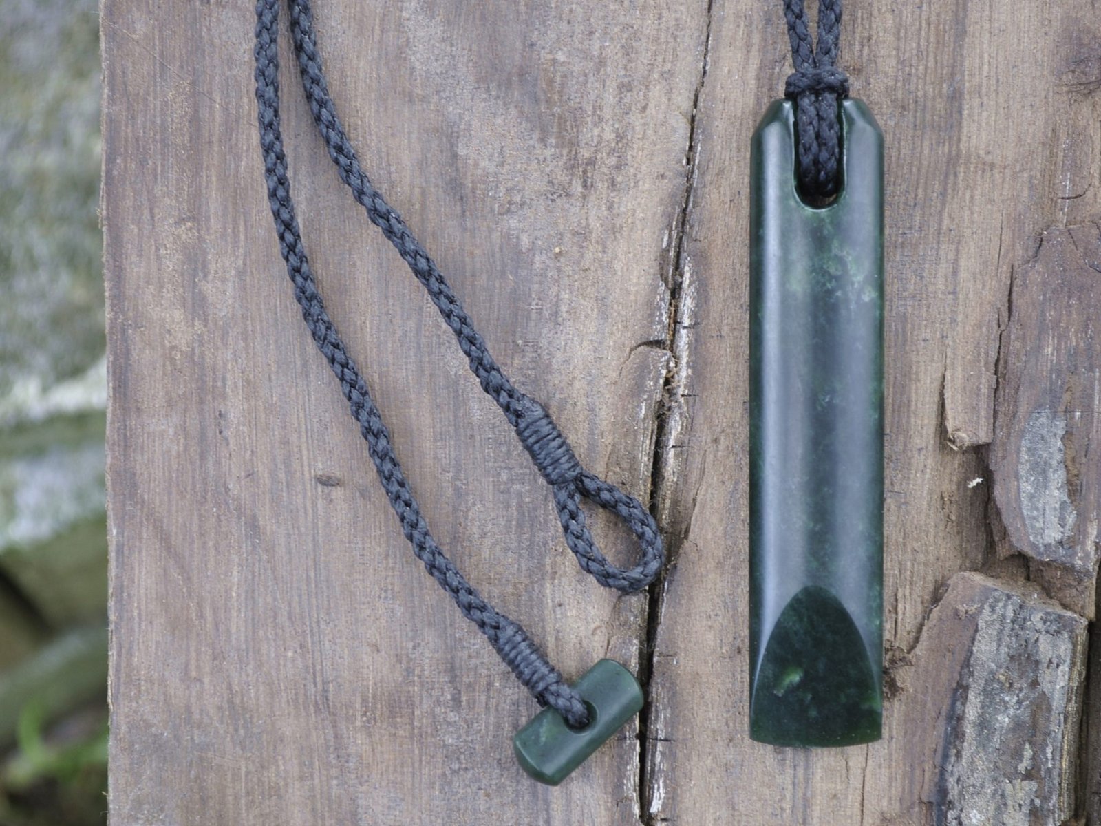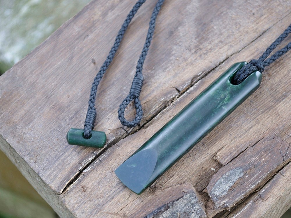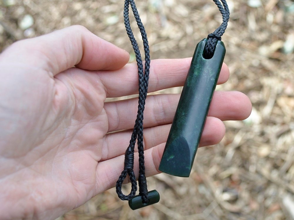Design: This pendant is based on a toki (which is a adze or axe shape).  Larger toki would have been for woodworking jobs like canoes or houses while smaller ones would have been used for finer work like carving.  They have been recorded from ancient Egyptian times up to the present day (now mostly made out of metal).  The design is normally associated with strength or someone who is a maker.
