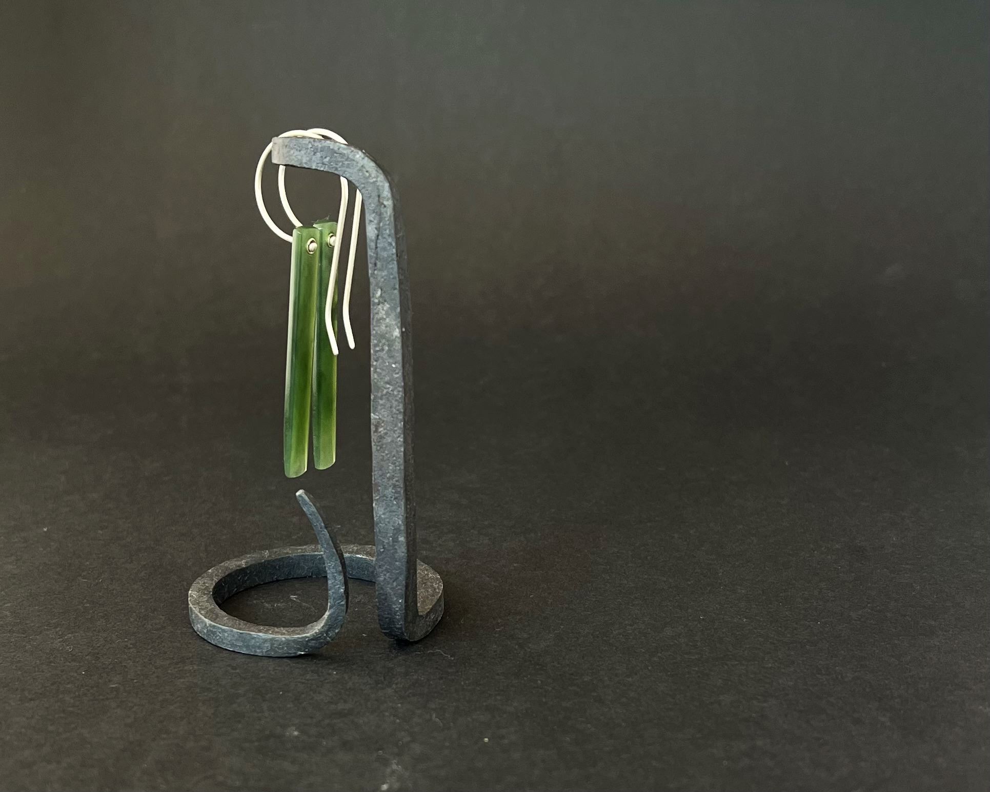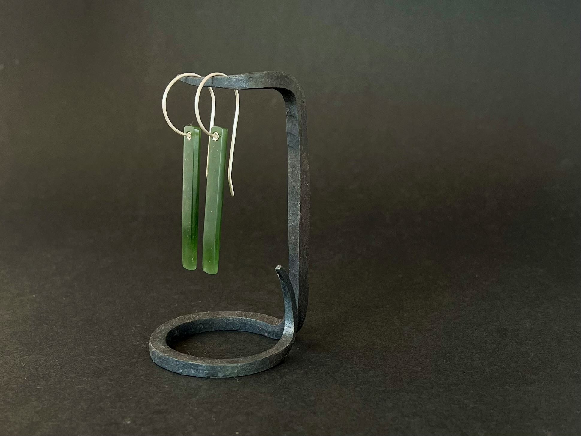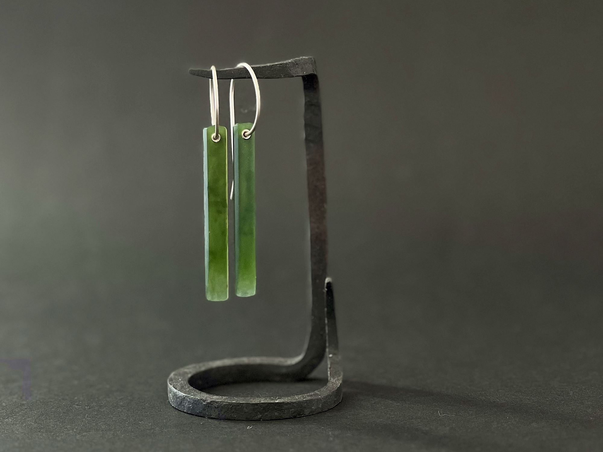 These earrings are made out of a translucent, green pounamu. Thin, faceted sides to reflect the light.