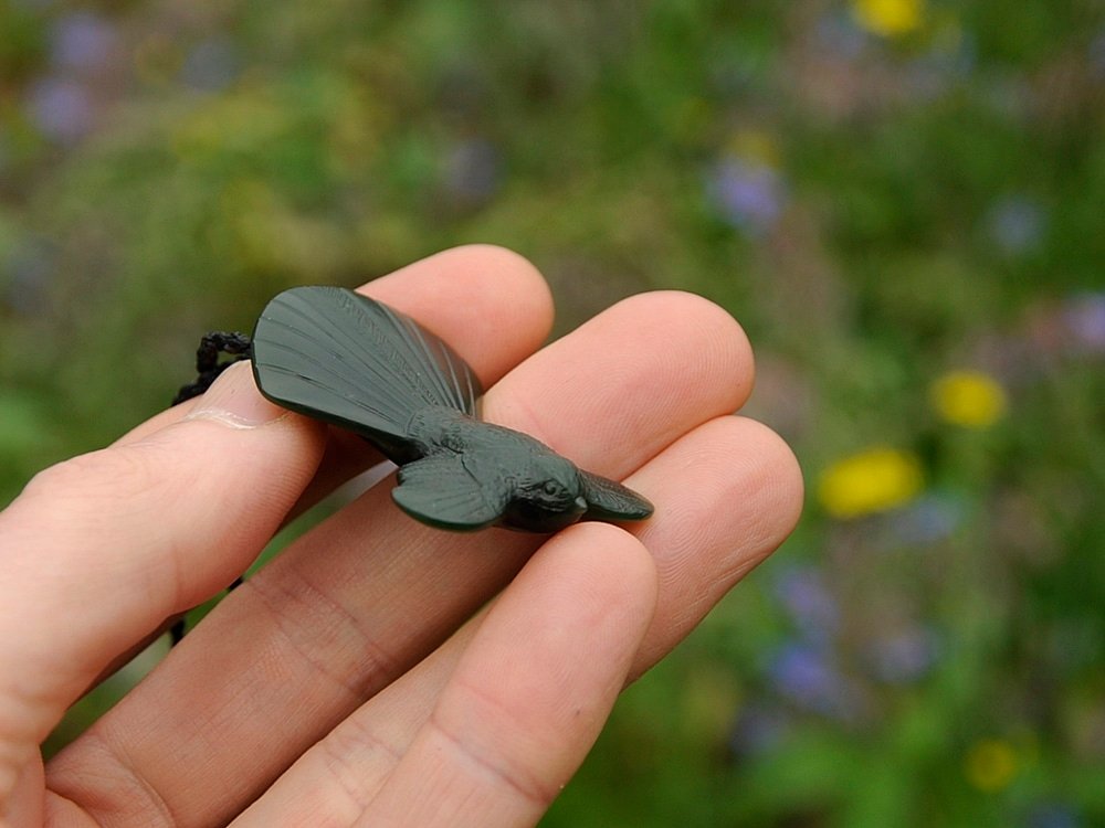 I carved this fantail / piwakawaka out of a dark green Pounamu. The pounamu looks almost black in the shade, deep green in the sunlight and has a great shine when backlit.