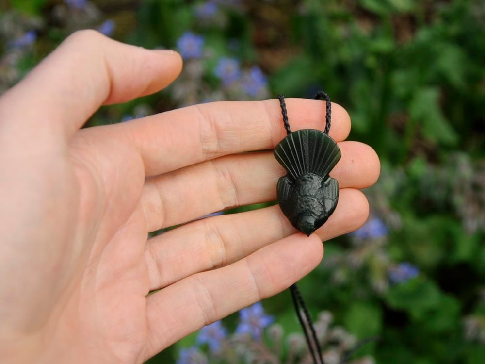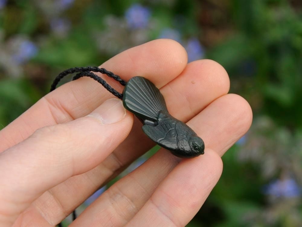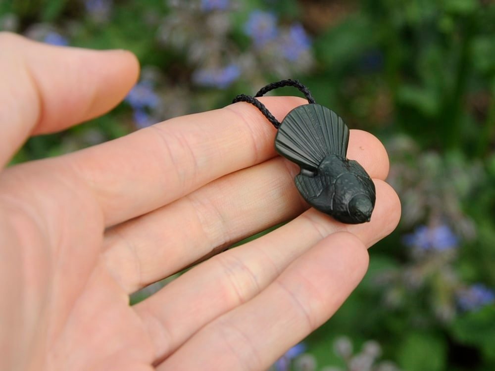 I carved this fantail / piwakawaka out of a dark green Pounamu. The pounamu looks almost black in the shade, deep green in the sunlight and has a great shine when backlit.