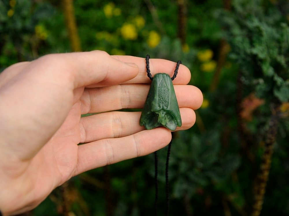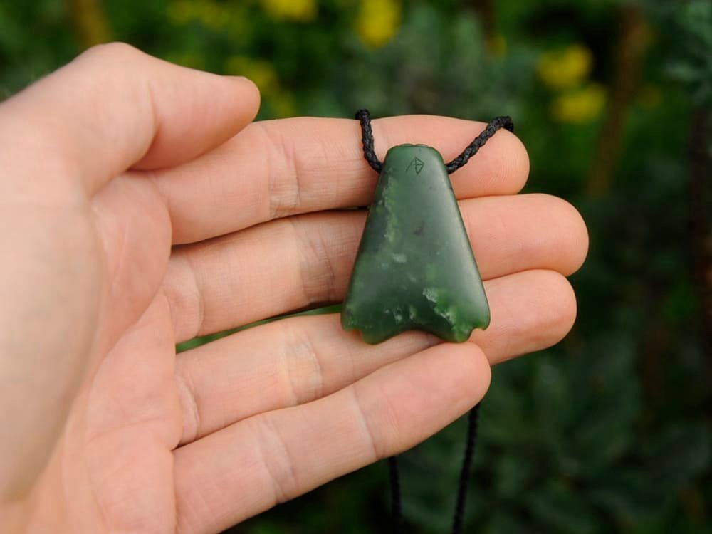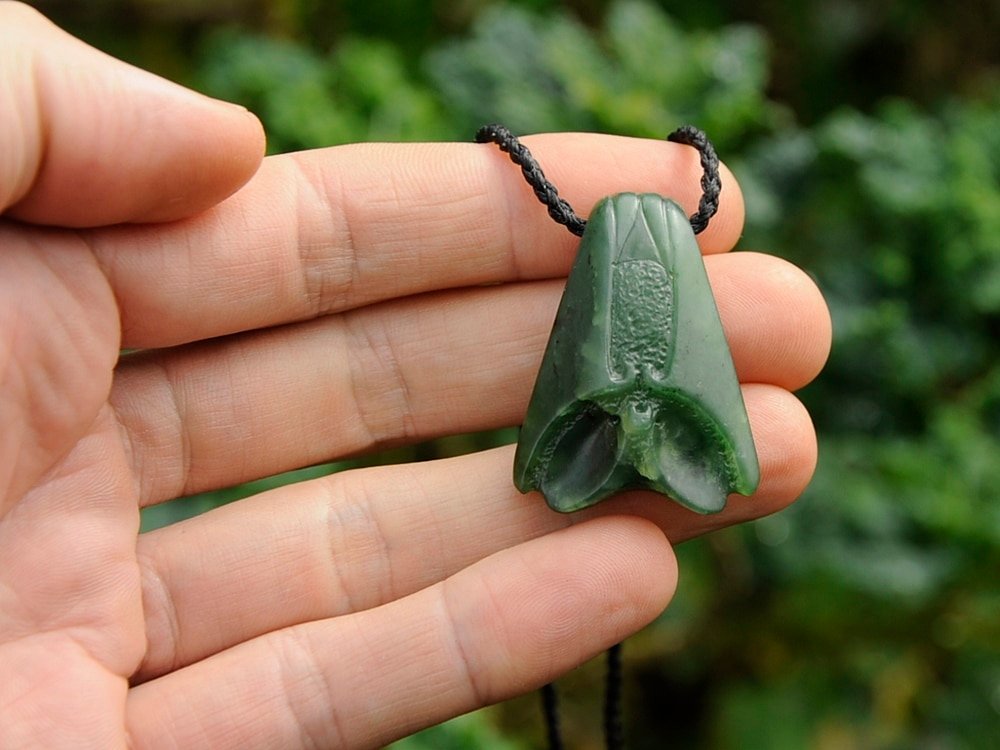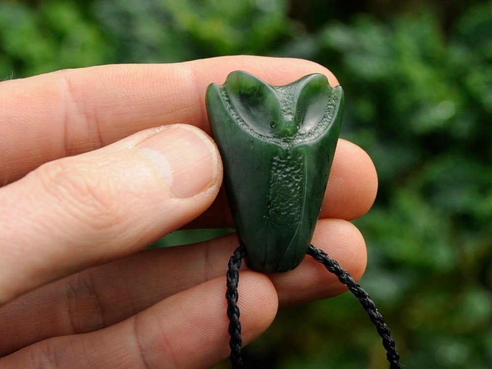 This is a beautiful green pounamu. It’s carved in my newer style with a rounded, fur textured body.