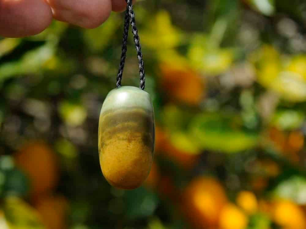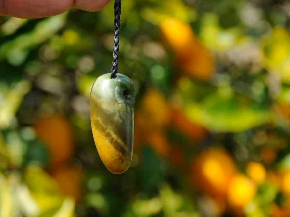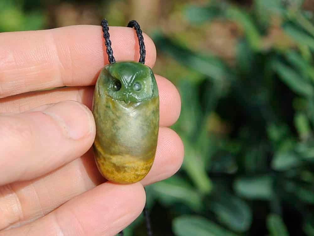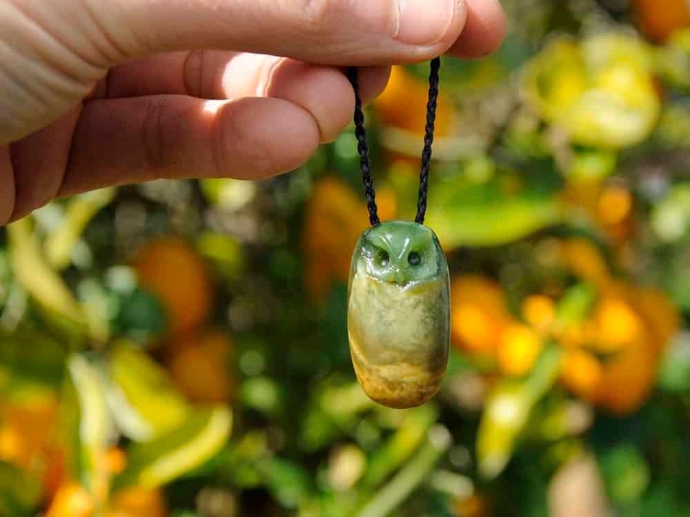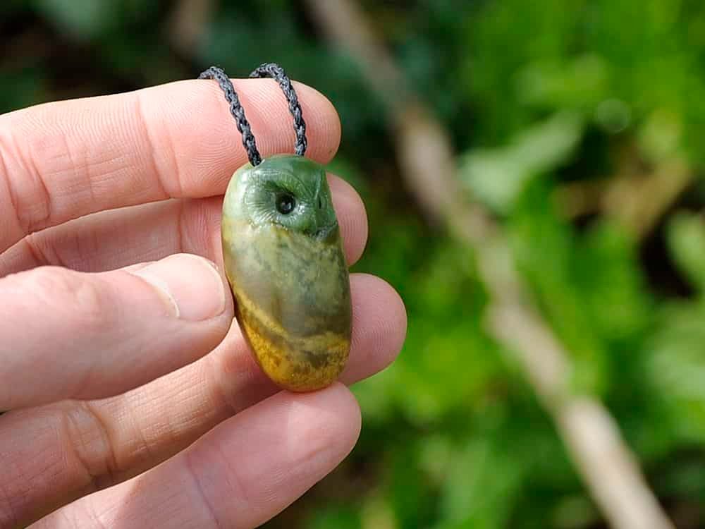 This pendant is of a Ruru / Morepork. The pounamu has a beautiful range of tones – his face is green, his body whitish with a yellow tail.