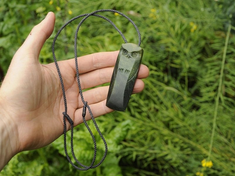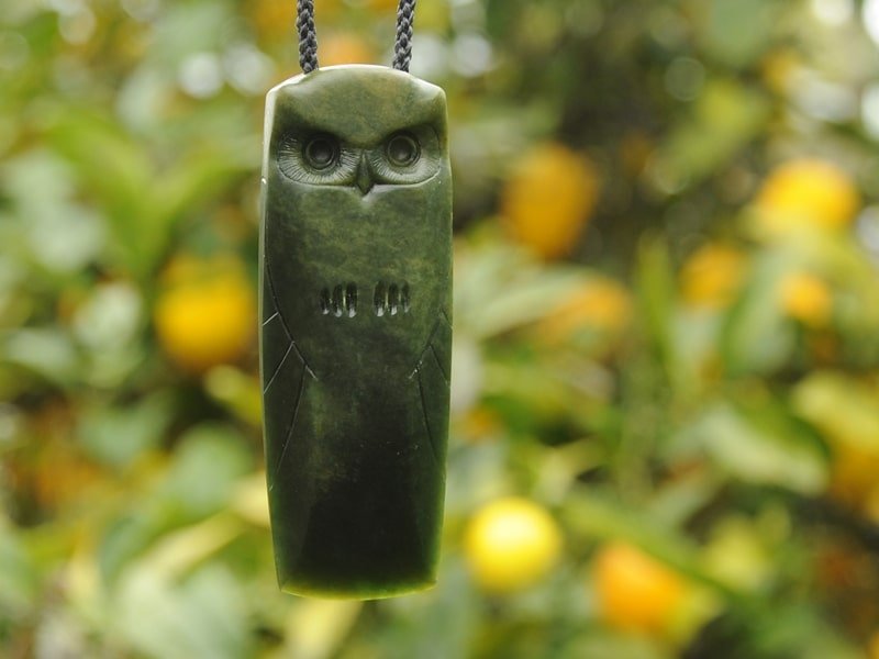 Pounamu Ruru Toki$780 Material – Pounamu Size – 84mm high, 30 wide Hand plaited 6 strand adjustable grey cord Shipping is free within NZ / Australia and a flat $20 NZD worldwide. Questions? – Get in touch FAQ Testimonials Out of stock Related products Jade Great Horned Owl $480 Chalcedony Kauri Snail Shell $580 Pounamu Ruru $720 Carnelian Crab Claw $470