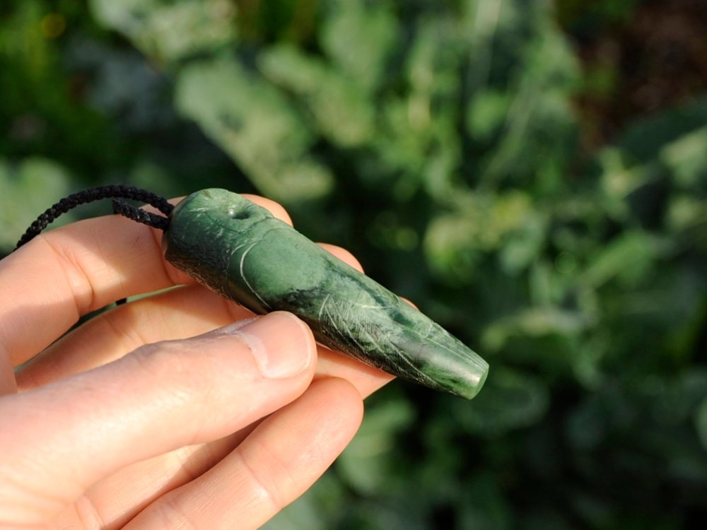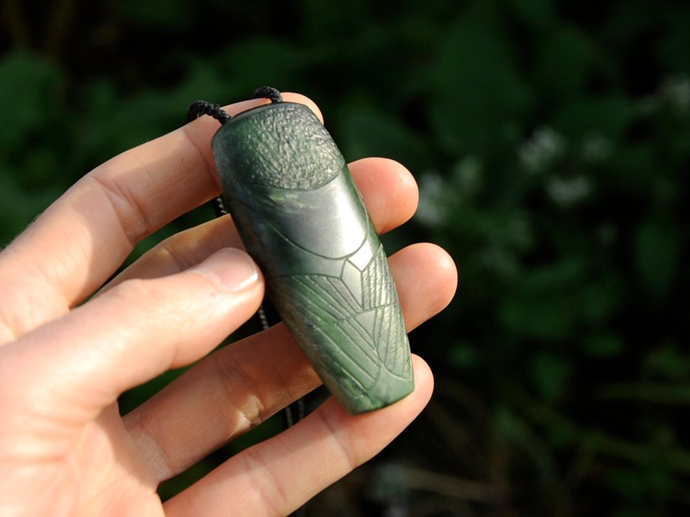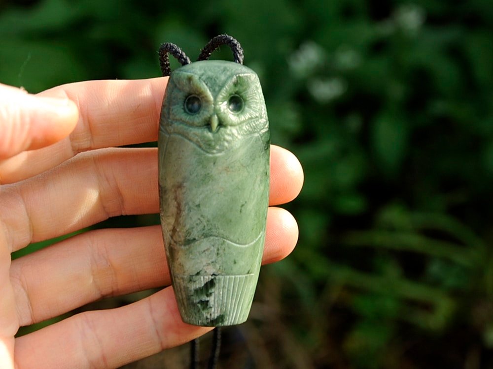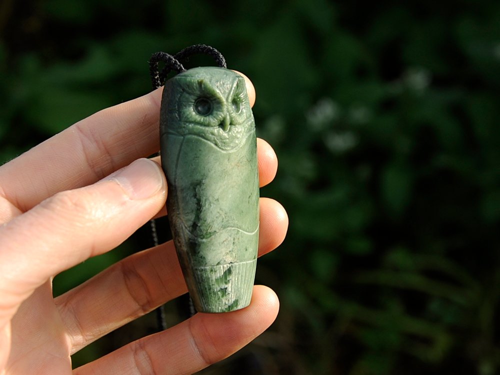 This sculpture/pendant is of a Ruru / Morepork.  I used the outside rind of the Pounamu for his lighter front and the darker green for his back/wings/tail.