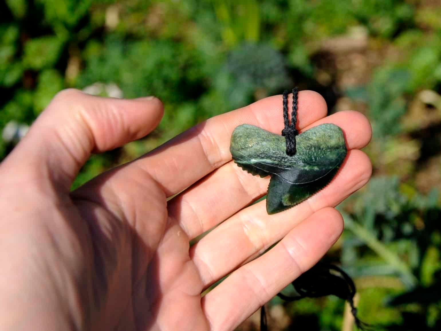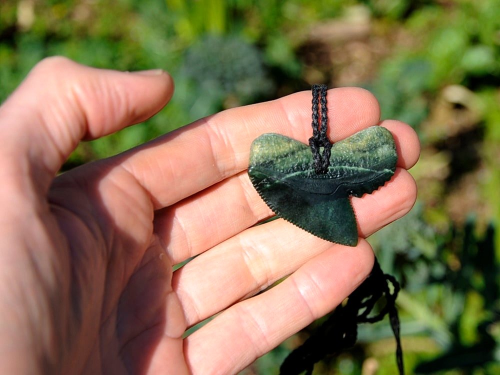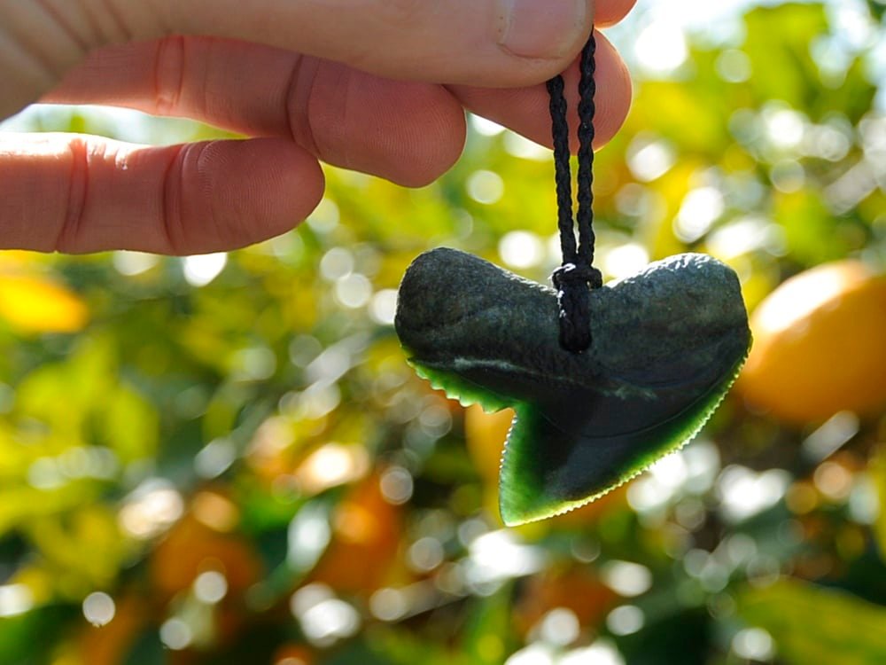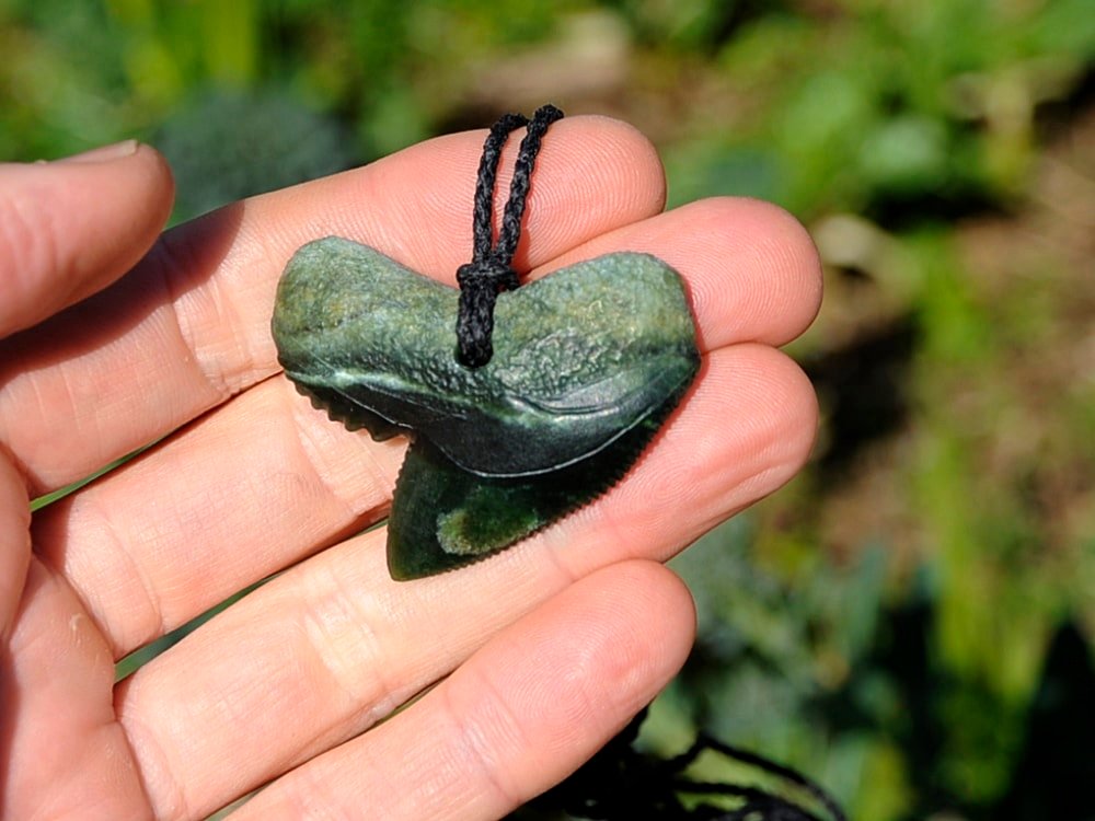 I’ve carved this pounamu tiger shark tooth out of a dark green pounamu with a light yellow rind.