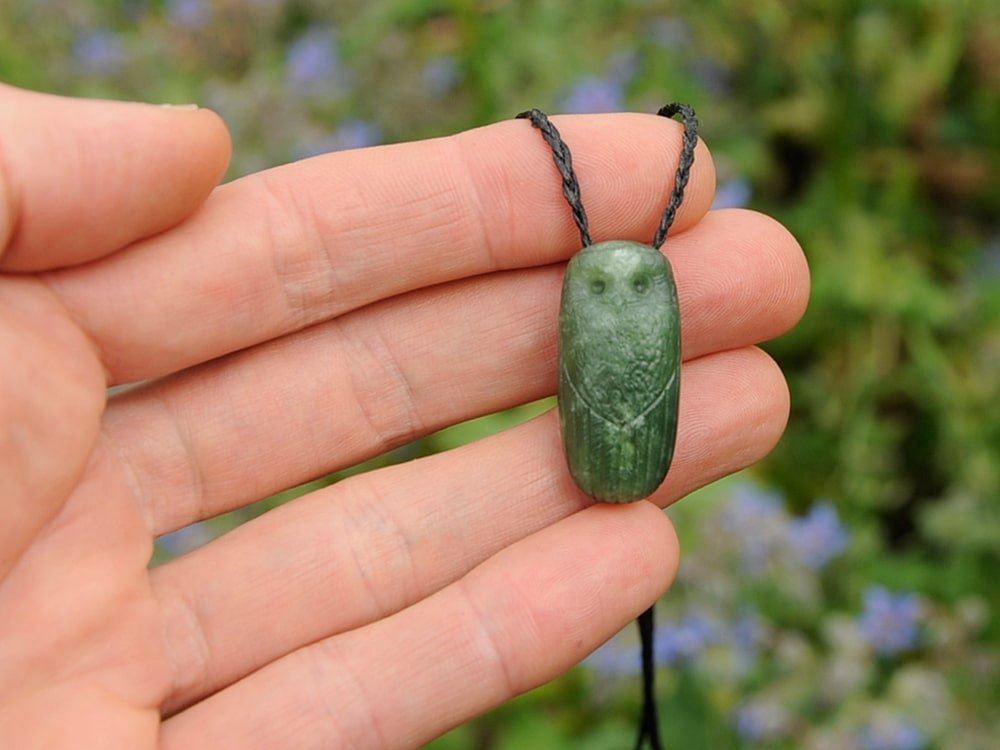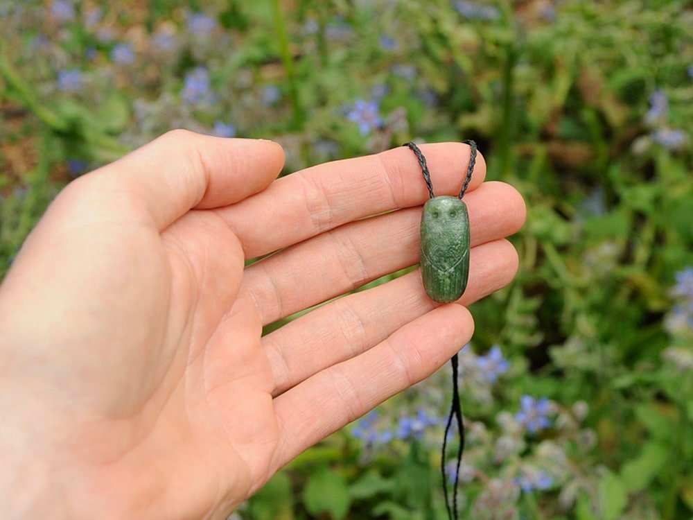 This pendant is of a Ruru / Morepork, one of our native owls. The pounamu is a beautiful light green with tight cloud fractures.