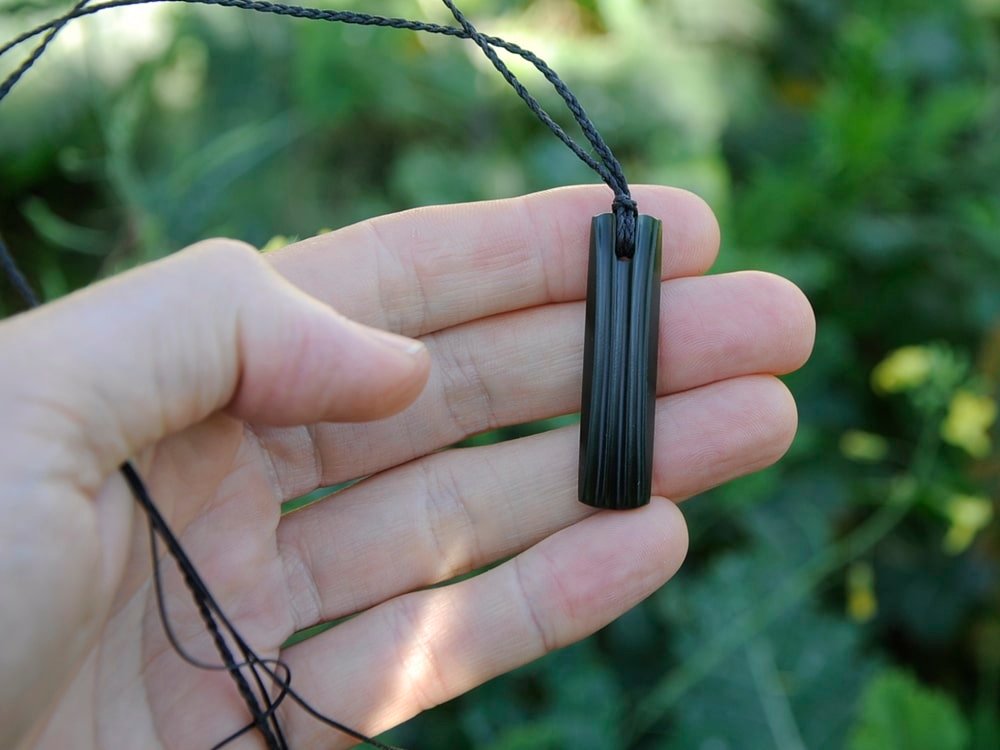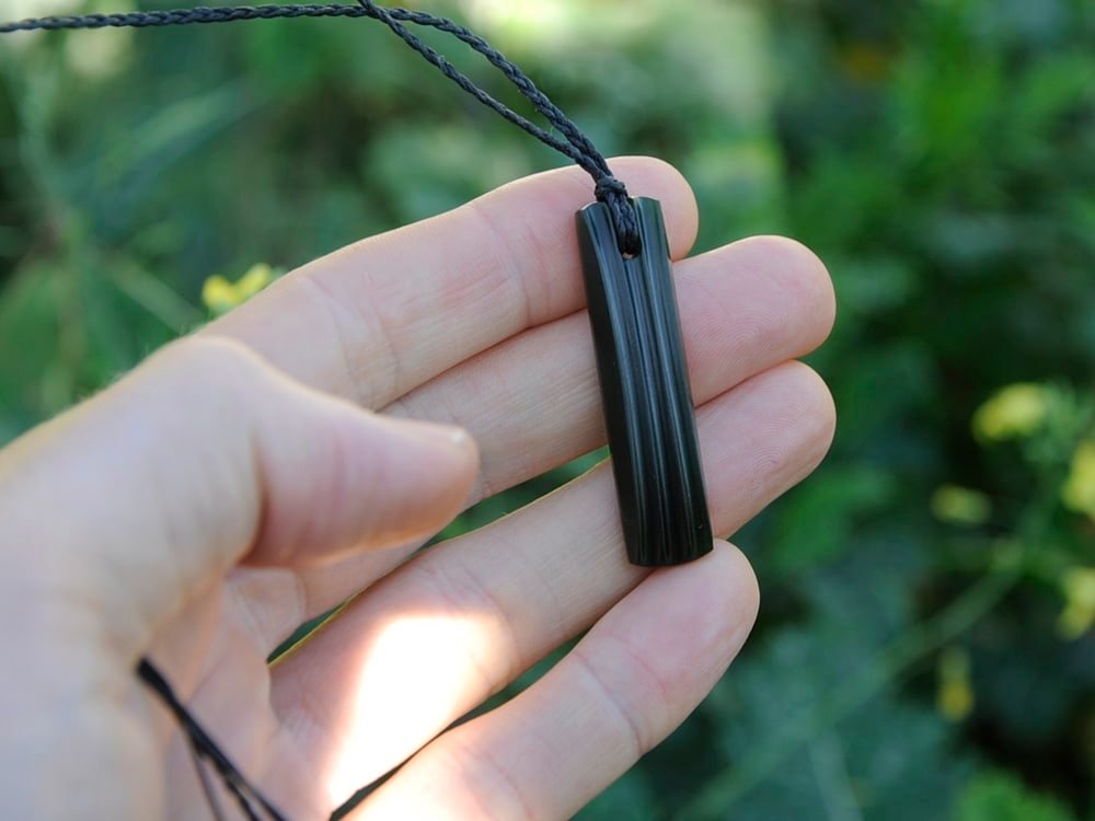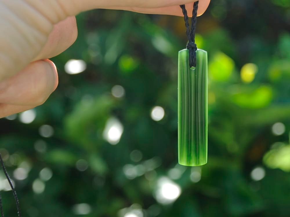 This piece is a small toki shape with a grooved front face. The deep green pounamu is wonderfully translucent.