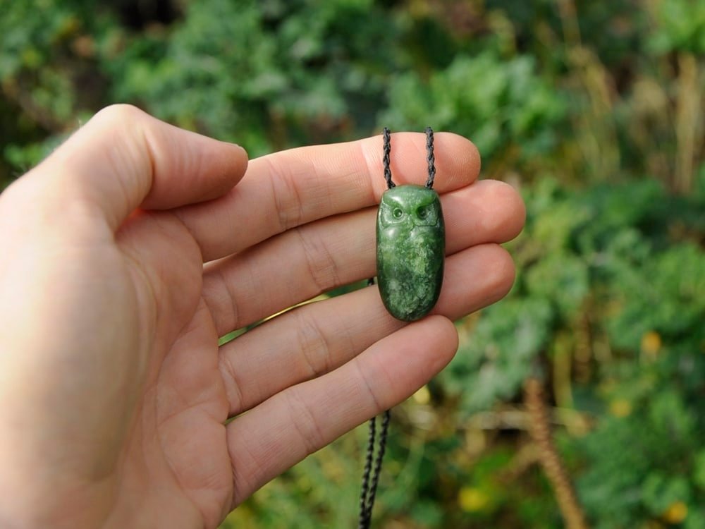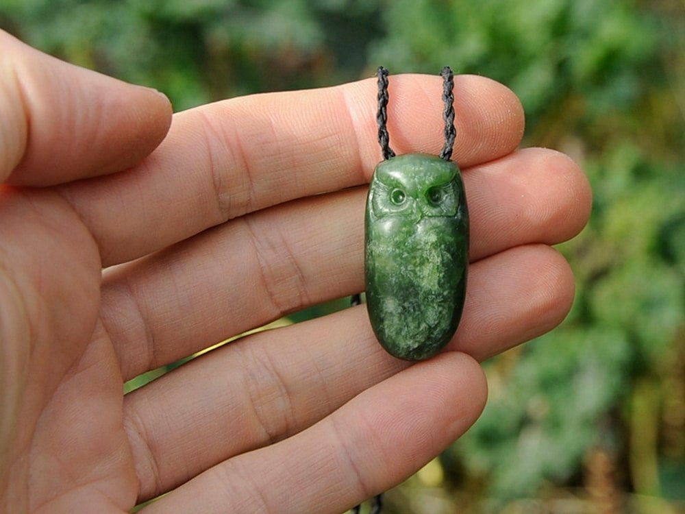I’ve carved this small Ruru out of a beautiful green pounamu with light cloud fractures.