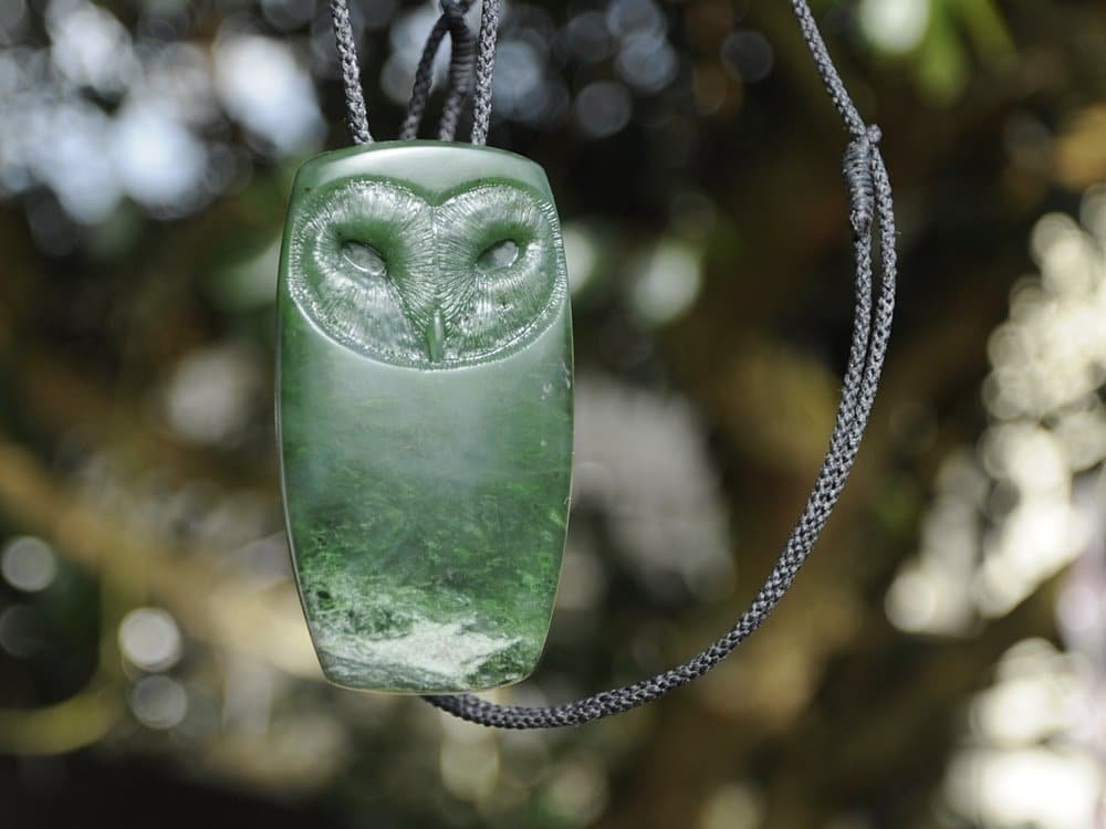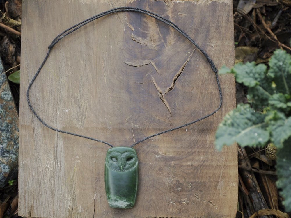 This barn owl is carved out of a beautiful jade from the Yukon, Canada. This a translucent mixture of swirly clear rivers and iridescent green flecks.